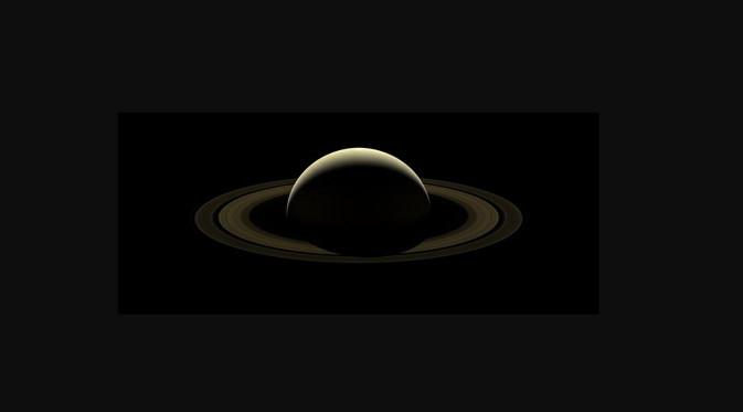 Diungkap NASA, foto tersebut diabadikan Cassini sesaat sebelum ia menuju lapisan atmosfer planet. Foto memperlihatkan wajah Saturnus dalam kegelapan bersimbah cahaya kecoklatan, dengan nuansa mistis dan dramatis.